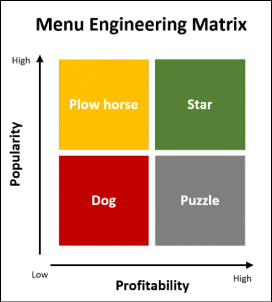 How does Menu Engineering work? You categorise the dishes on your menu on the basis of popularity and profitability. The program determines the popularity of each dish, based on the sales figures. Profitability is determined by the profit margin for each dish. You will be presented with a diagram showing four types of dishes, with suggestions to adapt and improve your menu for each type.