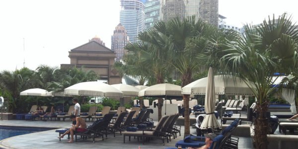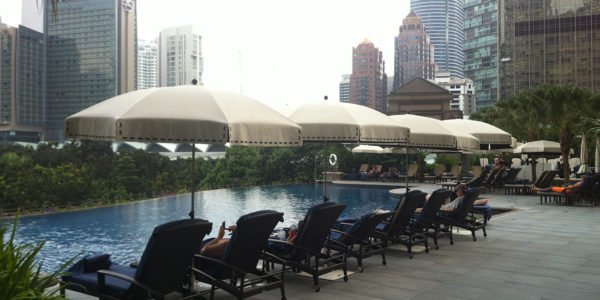 The Couture parasols feature at the Aqua Restaurant & Bar, overlooking the KLCC Park and the dramatic city skyline, dominated by the 451m-tall Petronas Twin Towers.