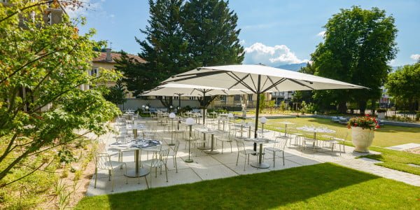 Hasta un total de 39 sillas bajo una sombrilla enorme, pero fácil de abrir y cerrar Amplíe la sombra de su terraza de hostelería a 39 m2 con 1 sombrilla (Ø 7 m redonda). La sombrilla Grandioso se abre y se cierra fácilmente sobre las mesas y las sillas gracias a nuestro …