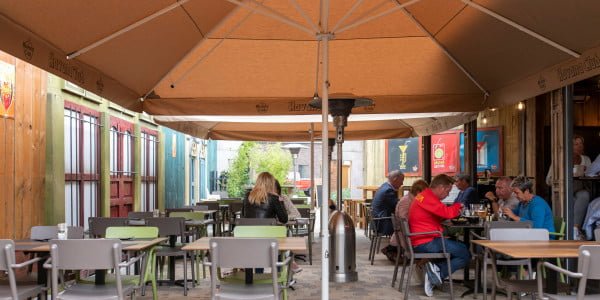’t Zonneken leerde Symo kennen op de horecabeurs in Gent. Ze wilden hun terras, dat geen evidente opstelling heeft, vernieuwen. Maximale overdekking en hoogteverschillen waren belangrijke aandachtspunten.